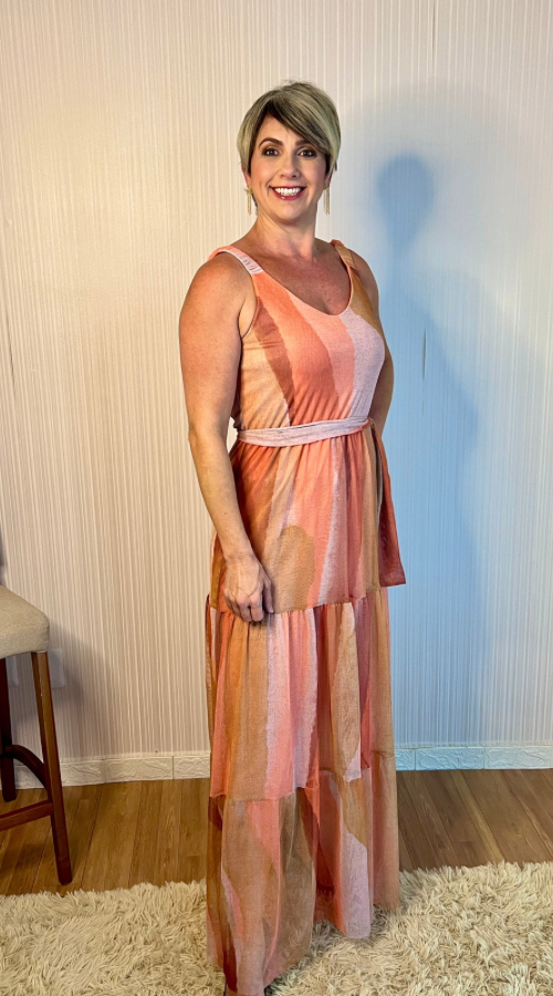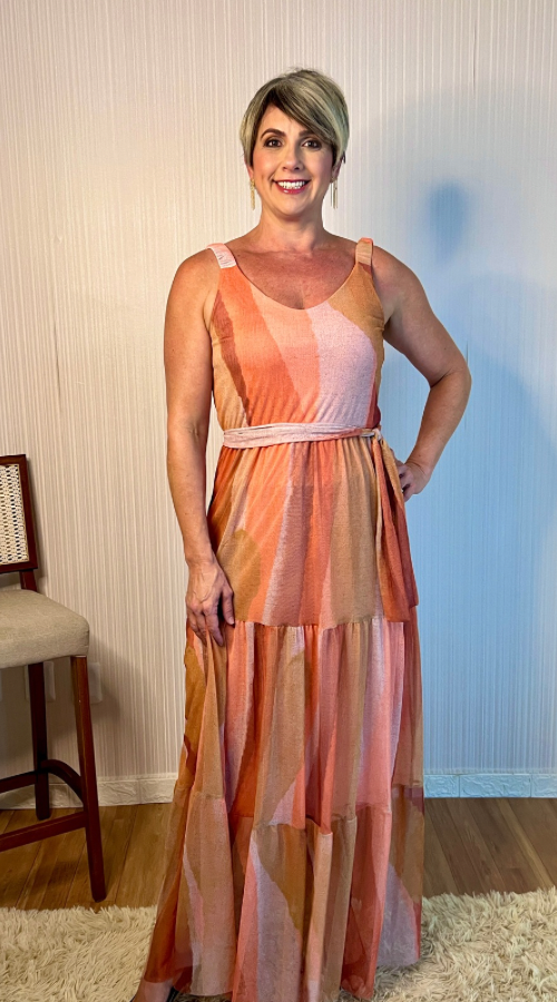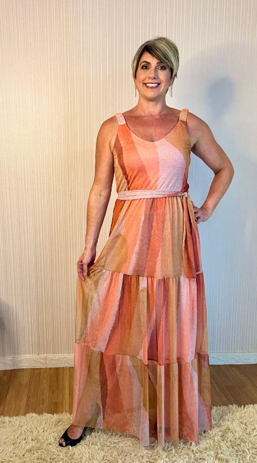 Nosso vestido é leve, fresco, seu tecido é em tule. Possui forro, amarração opcional e o melhor: não precisa passar. Veste M (42) e G (44).